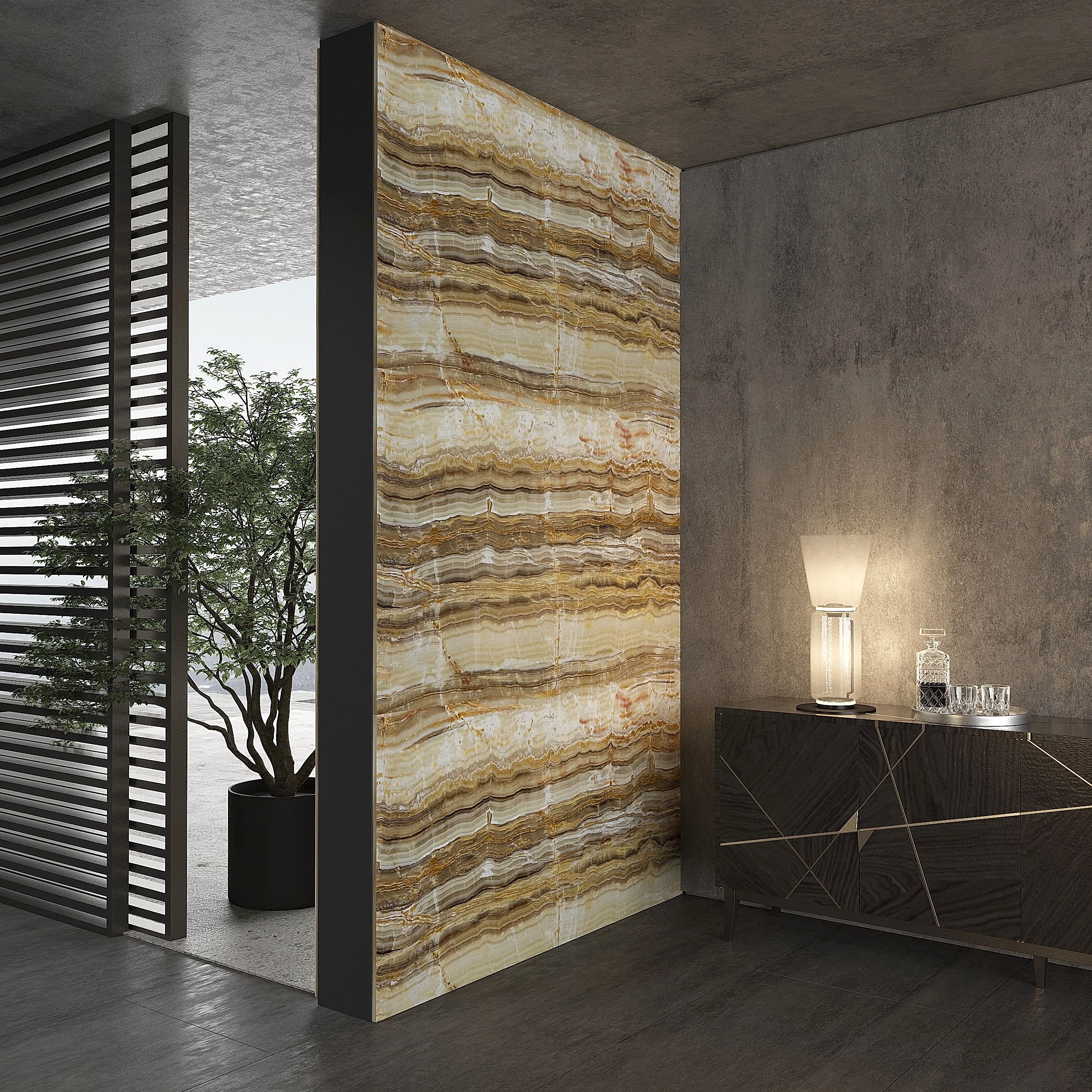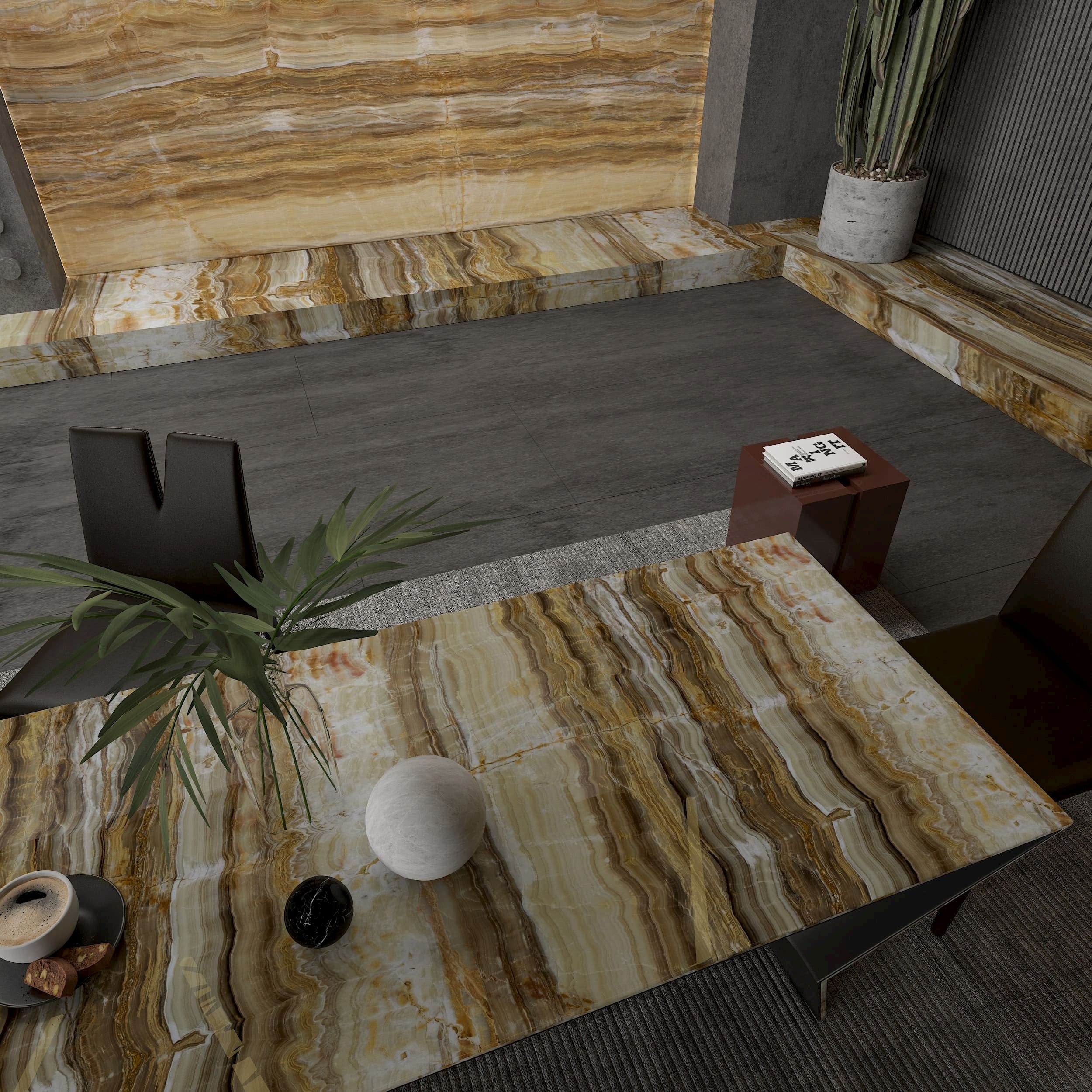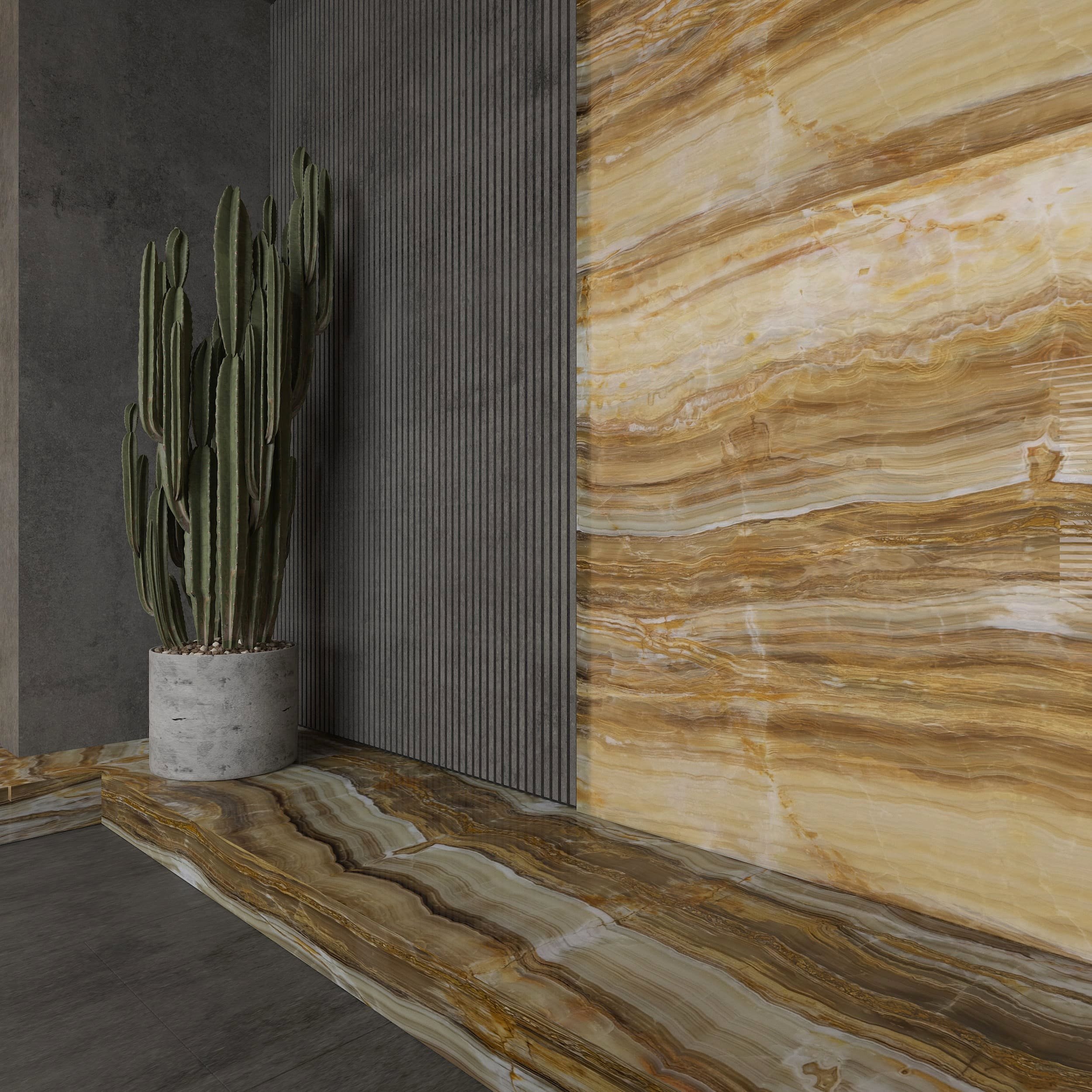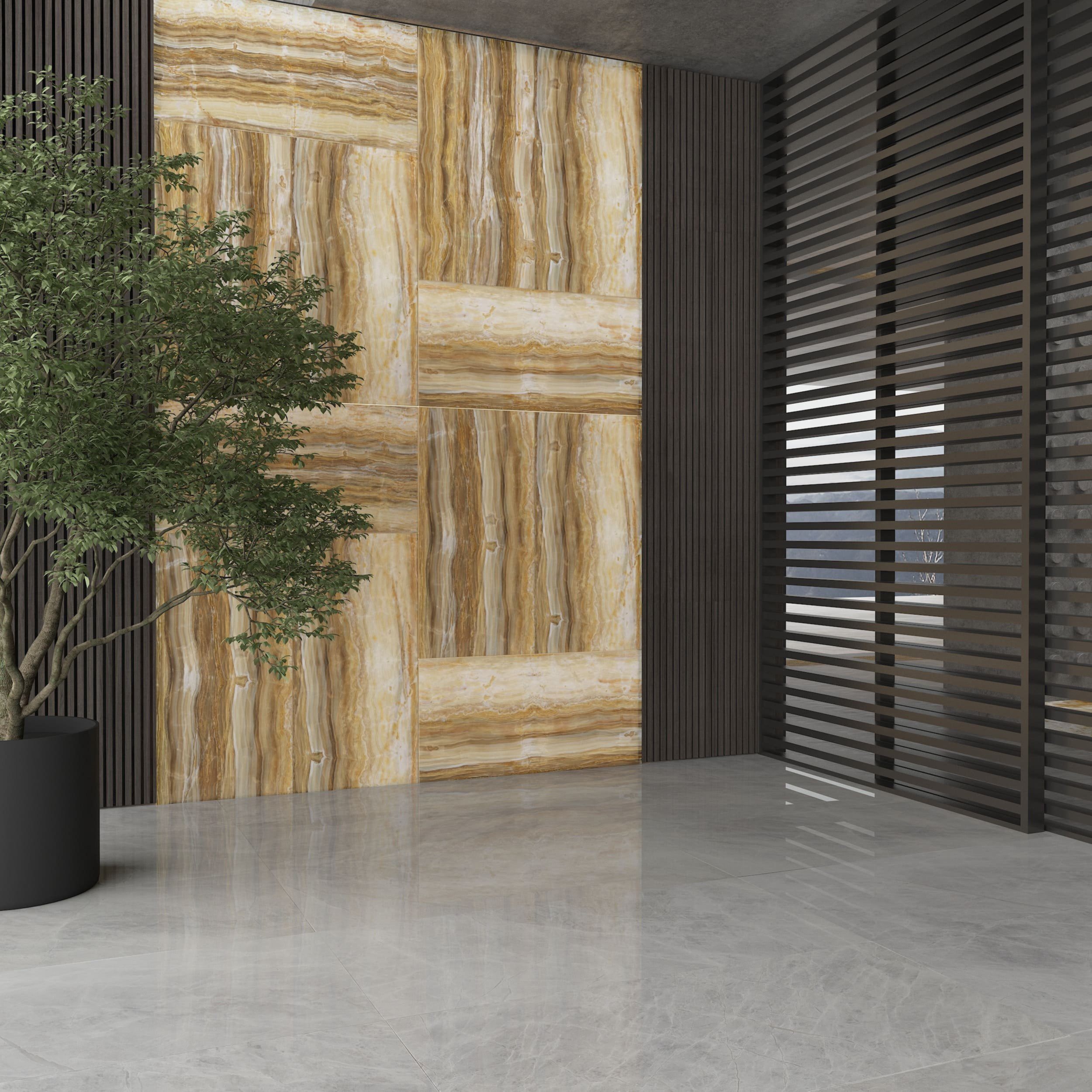 Golden Vein Onyx, one of the most popular natural stones with its light transmittance, creates a stylish look in your living spaces with the contrast transition of beige and brown tones. This onyx stone, which we extract from our own quarry, is cut in different sizes and processed to make it suitable for your project. For more information about Golden Vein Onyx, please contact us.